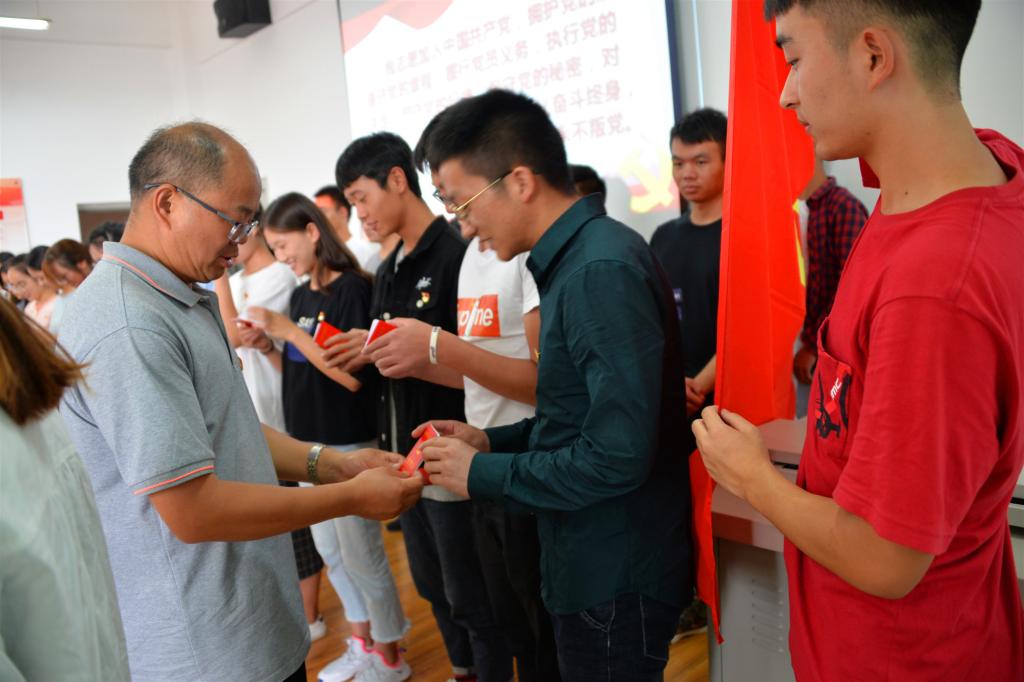宣誓仪式上,党总支书记翟书华发放了党费证。42名新党员佩戴党员徽章在领誓人张国斌的带领下,紧握右拳,面对鲜艳的党旗庄严宣誓,洪亮的声音表达了他们对党的忠诚和热爱。入党宣誓仪式让新党员受到了一次神圣的洗礼,他们将在今后的学习工作中用党员的标准严格要求自己,加强党性修养,改进自身缺点,用实际行动来践行今天的铮铮誓言。