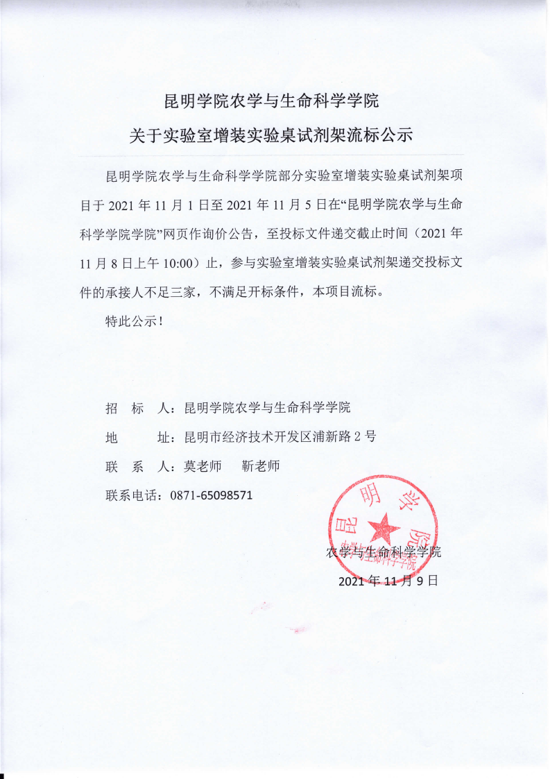 beat365中国官方网站关于实验室增装实验桌试剂架流标公示