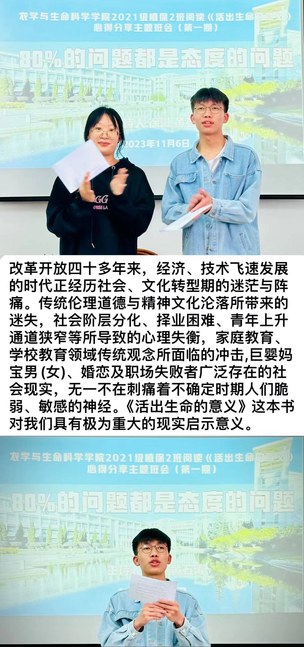 引导和帮助同学们学会自我管理、自我教育、自我培养,是我学生工作的一大特色。自2022年10月份以来,2021级植物保护2班全体同学,充分利用课余时间,放下手机,拿起书本,共同学习、相互欣赏、共同进步,每一至二周定期开展一次两个小时左右的读书心得分享班会。同学们选择自己喜欢的或老师们推荐的书,在课余时间认真阅读同时做好读书笔记,并利用读书心得分享班会时间,把自己从阅读中学习到的对自己思维、学习、人际交往、心理疏导等有帮助的方法、观点或自己学习的感悟与同学们进行分享。特别值得欣慰的是从主持到分享者,班会主题词制定、背景PPT制做等都是同学们自己完成,而且很有针对性,设计上也有一定的高度。最难得的是每一个同学都能积极配合班委工作,认真准备自己的分享稿;最大的收获是大家在分享的过程中都很开心并深受启发。全班46个人,没有一个退缩、害怕,都能够站上讲台,面对全班同学勇敢发声。分享的内容、方式都不是最重要的,重要的是大家在一起共同学习、彼此鼓励、共同进步。 同时 加深了彼此的了解,建立起良好的同学情谊、师生情!