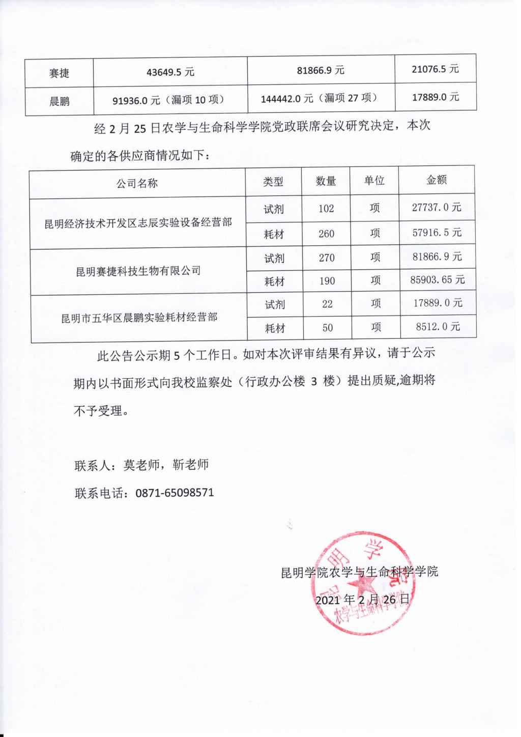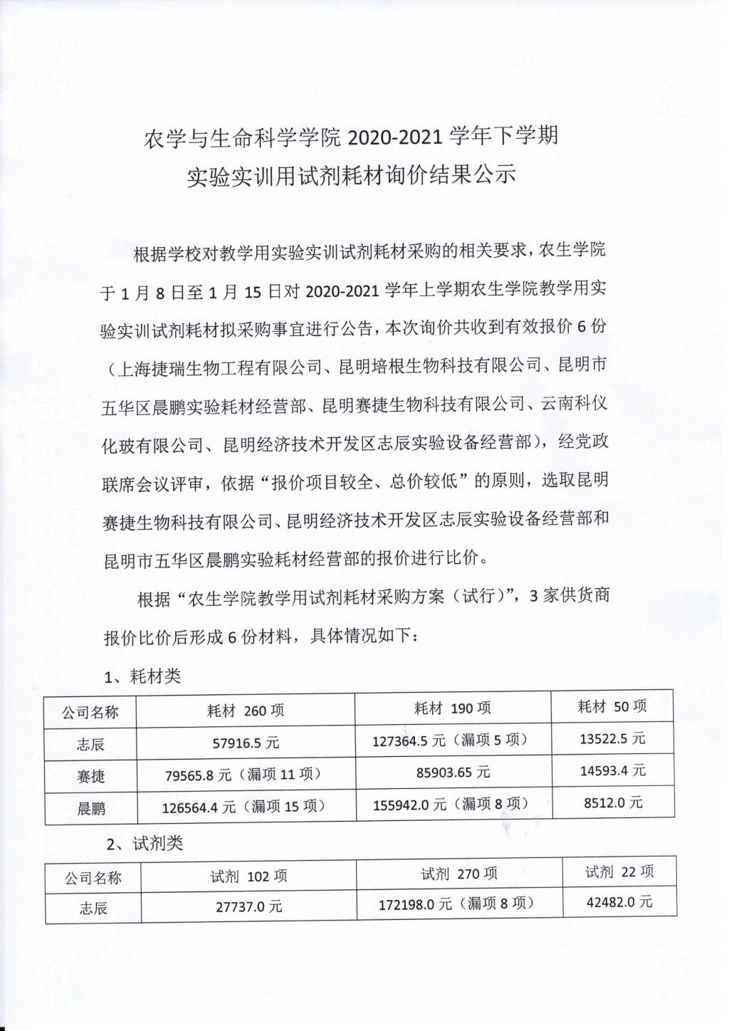 农学与生命科学学院2020-2021学年下学期实验实训用试剂耗材询价结果公示