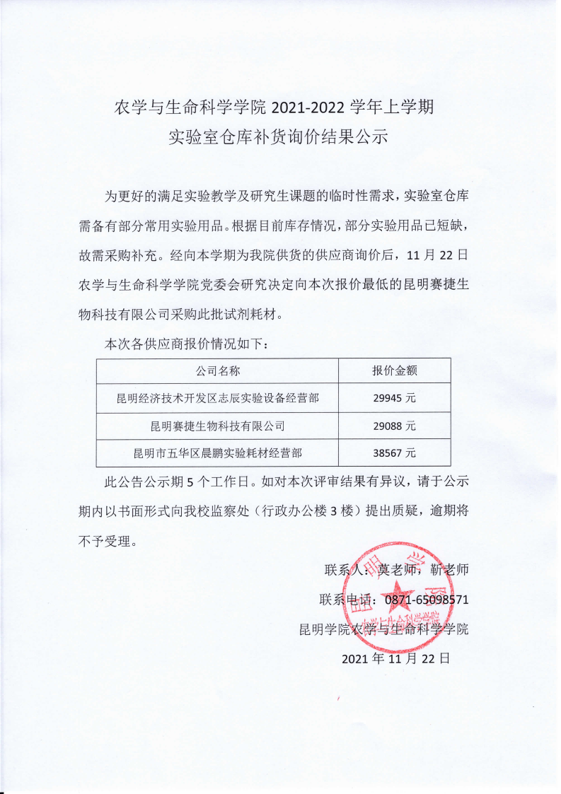 农昆明学院学与生命科学学院2021-2022学年上学期实验室仓库补货询价结果公示