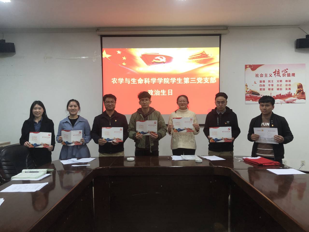 农学与生命科学学院学生第三党支部于2019年12月13日在农学楼1601会议室召开预备党员转正大会暨2019年度组织生活会会前集体学习,并为11、12月份加入党组织的党员举行政治生日仪式。